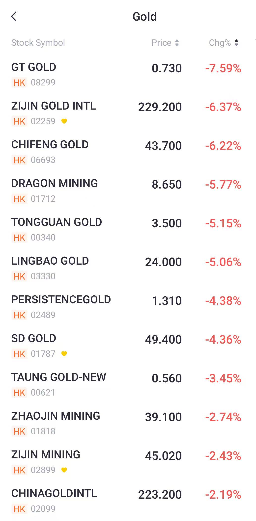 Gold stocks fell in Hong Kong market. GT Gold down over 7%; Zijin Gold, Chifeng Gold down over 6%; Dragon Mining, Tongguan Gold down over 5%; SD Gold down over 4%.