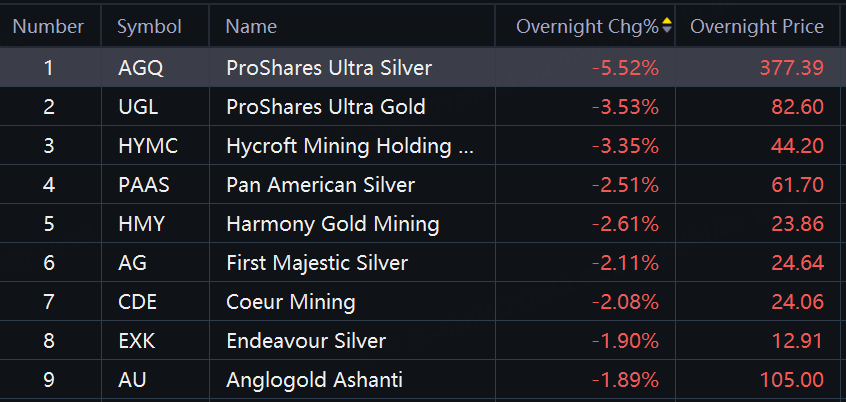 Precious metal shares & ETFs fell in overnight trading with AGQ down over 5%, UGL, HYMC down over 3%; Pan American Silver, Harmony Gold down over 2%.