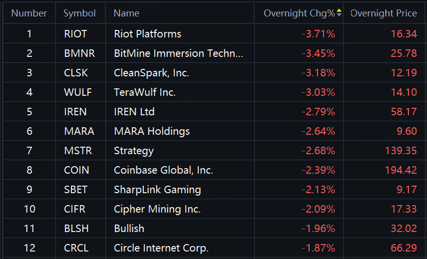 Crypto shares slid in overnight trading as bitcoin fell below $82K. Riot Platforms, BitMine, CleanSpark down over 3%.