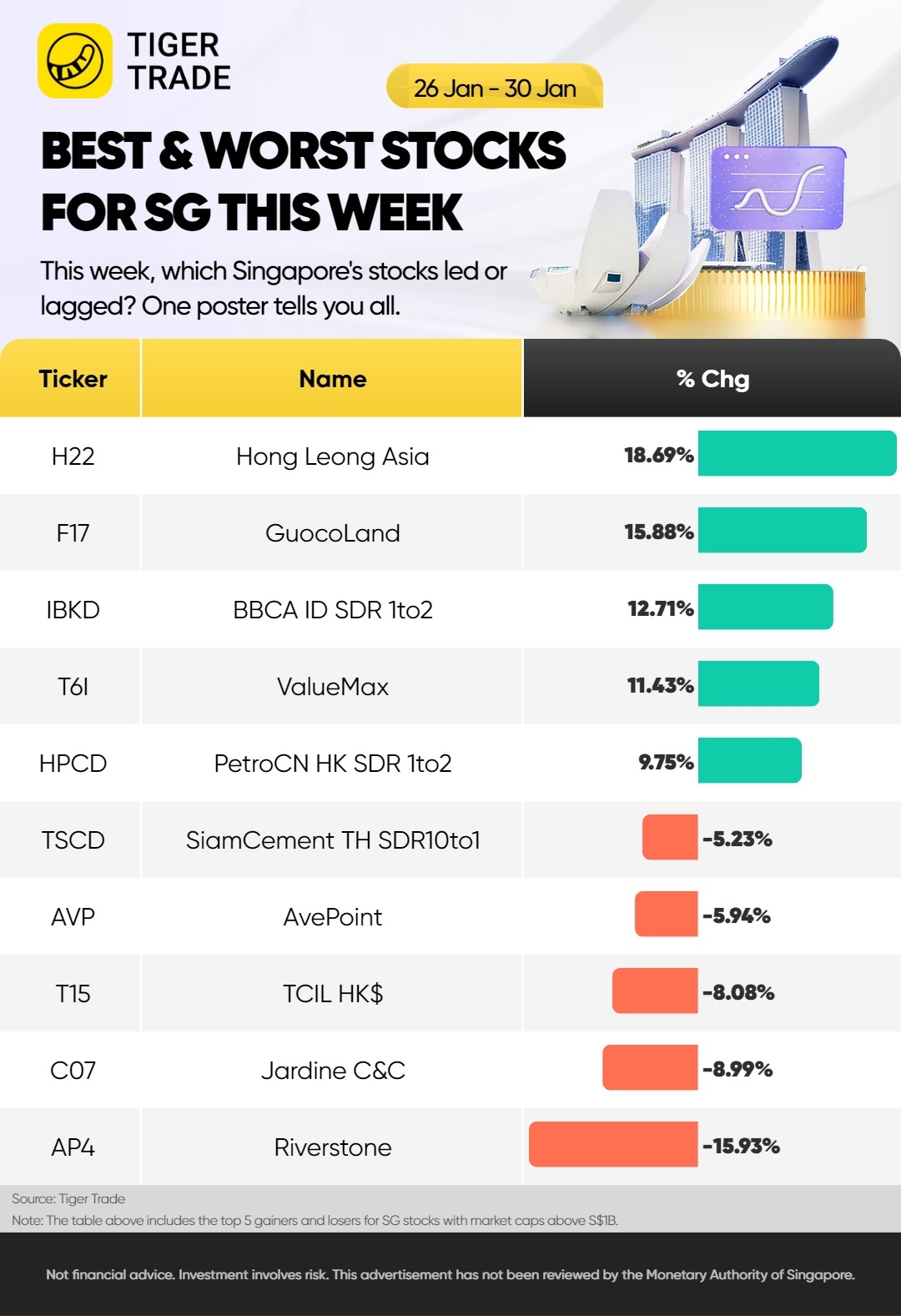 In terms of individual stocks, Hong Leong Asia rose 19%; Guocoland rose 16%; ValueMax rose 11%; while Riverstone fell 16%; Jardine fell 9%; AvePoint fell 6%.