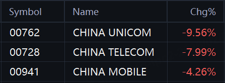 Chinese telecom operators dropped in Hong Kong. China Unicom fell 10%; China Telecom fell 8%; China Mobile fell 4%.