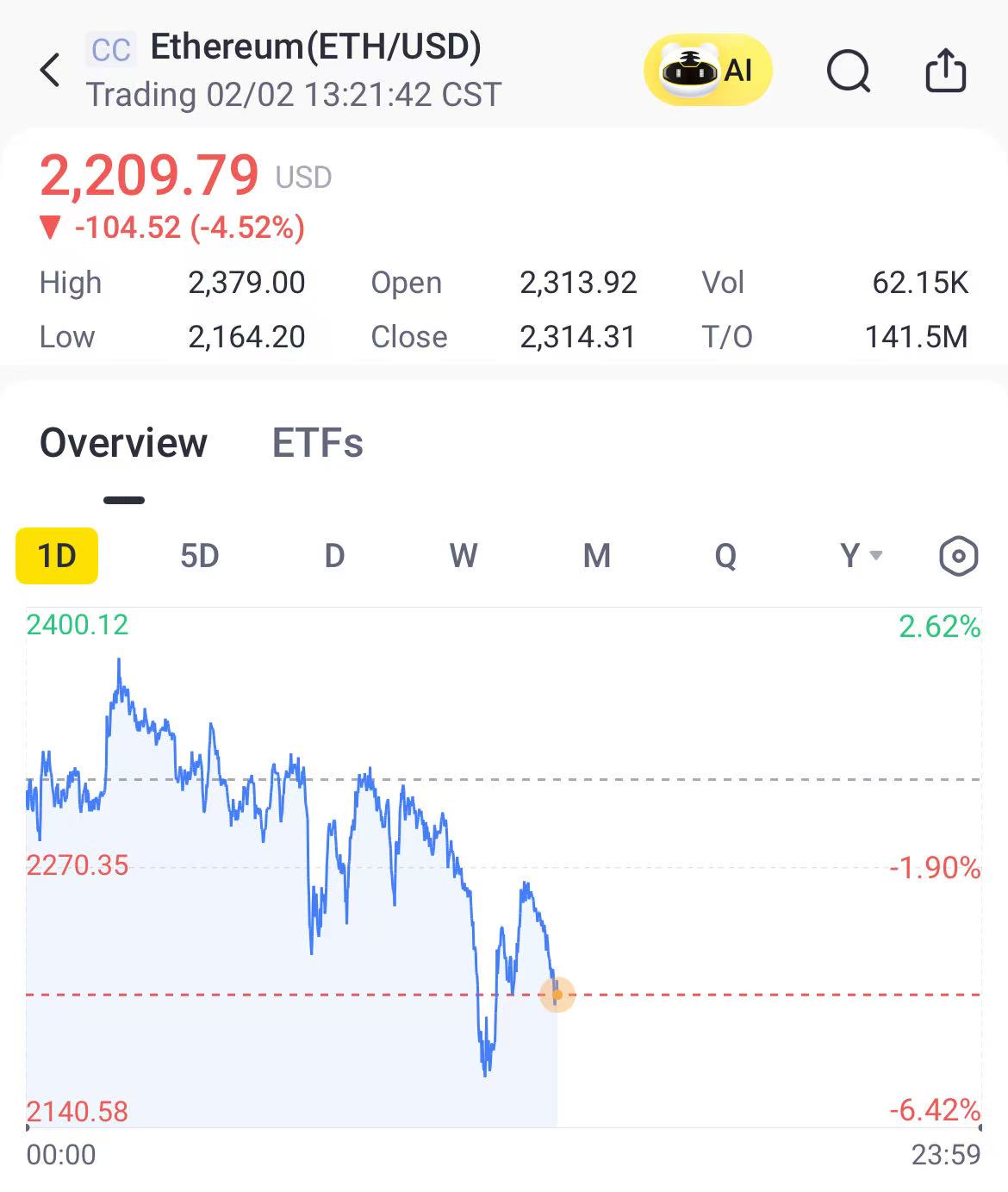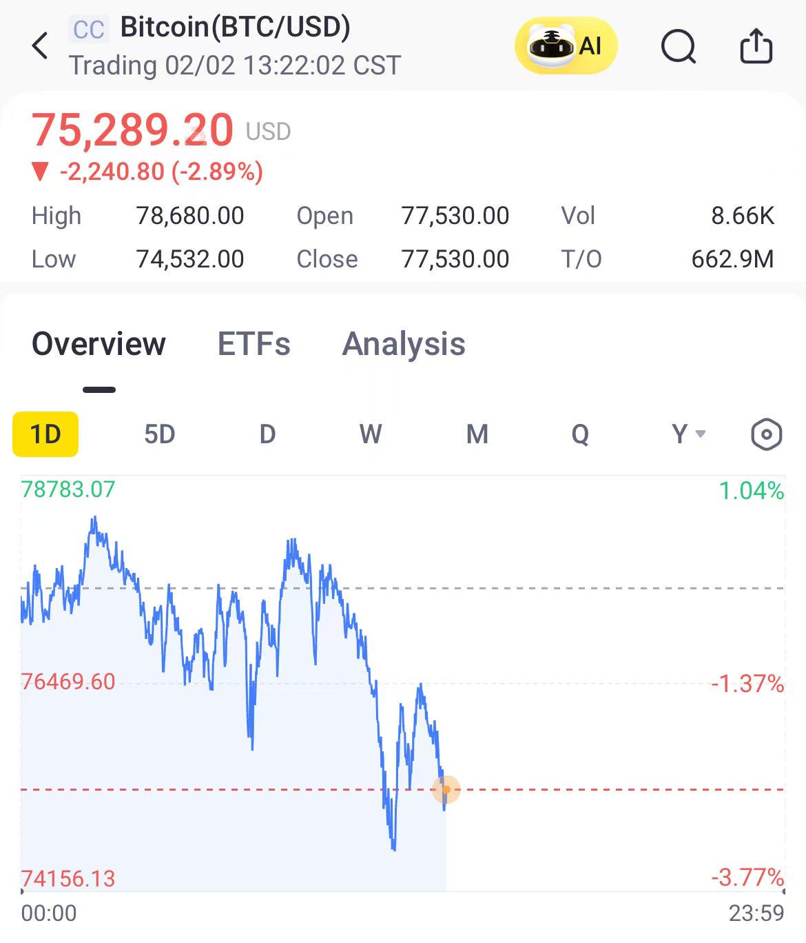 Bitcoin Falls to 10-Month Low of $74,289; Ethereum Slides to 2,209, Lowest since June 22 Last Year.