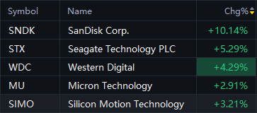 SanDisk up 10%; Seagate up 5%; Western Digital up 4%; Micron up 3%.