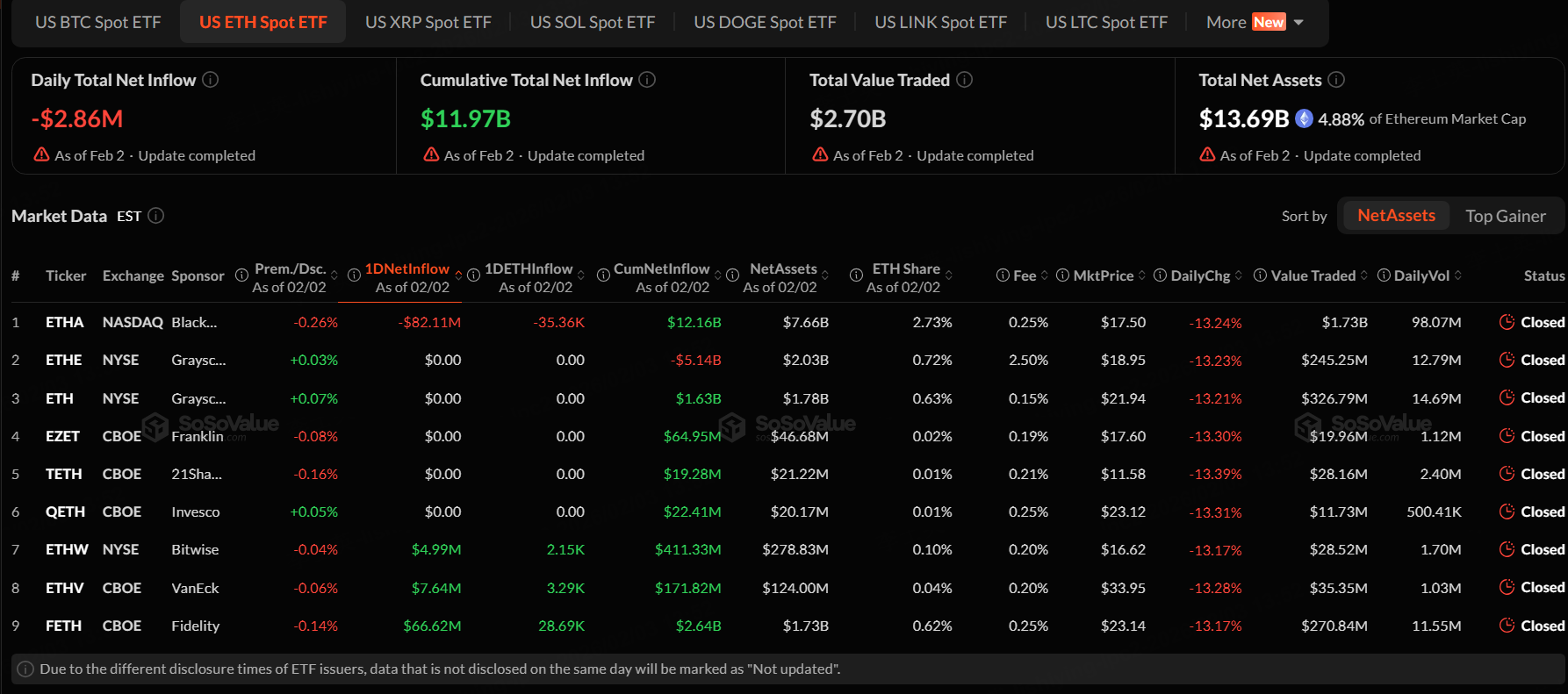 The Ethereum spot ETF with the highest netoutflow on February 2 was iShares Ethereum Trust ETF (ETHA), with a net outflow of $82.11 million, according to SoSoValue.