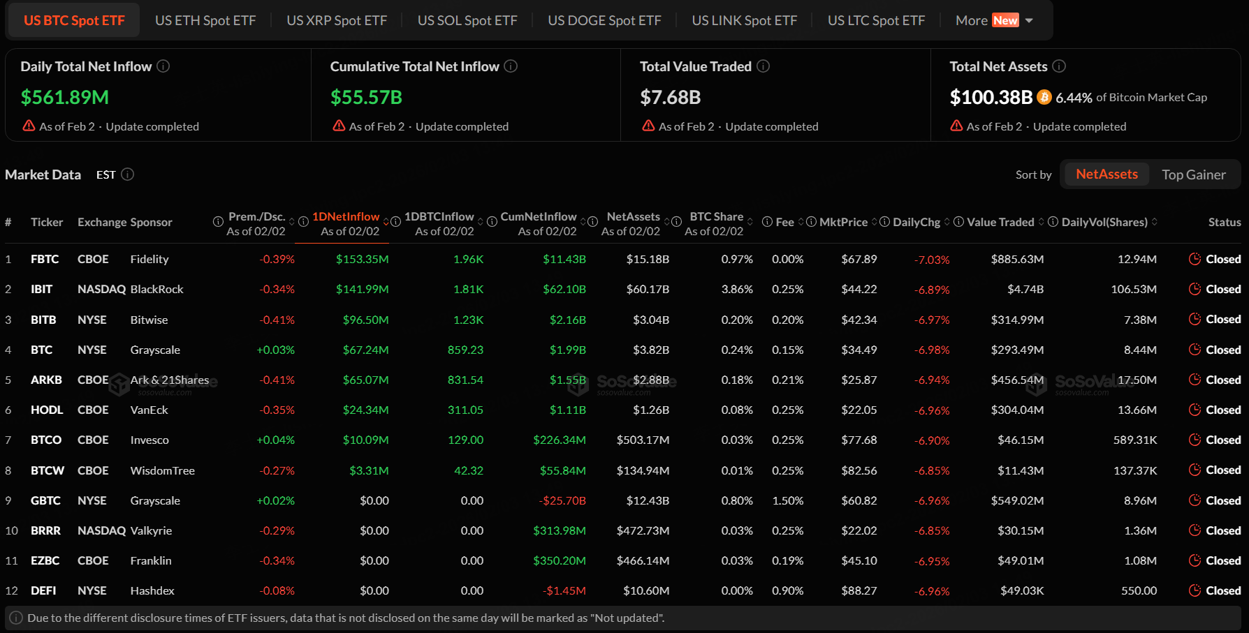 The overall net inflow of the US Bitcoin spot ETF on Monday was $561.89 million. The total net asset value of Bitcoin spot ETFs is $100.38 billion, and the ETF net asset ratio (market value compared to total Bitcoin market value) is 6.44%.