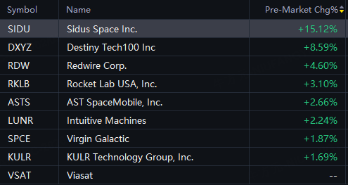 Sidus Space up 15%; DXYZ up 9%; Redwire up 5%; Rocket Lab, AST SpaceMobile up 3%; Intuitive Machines up 2%.