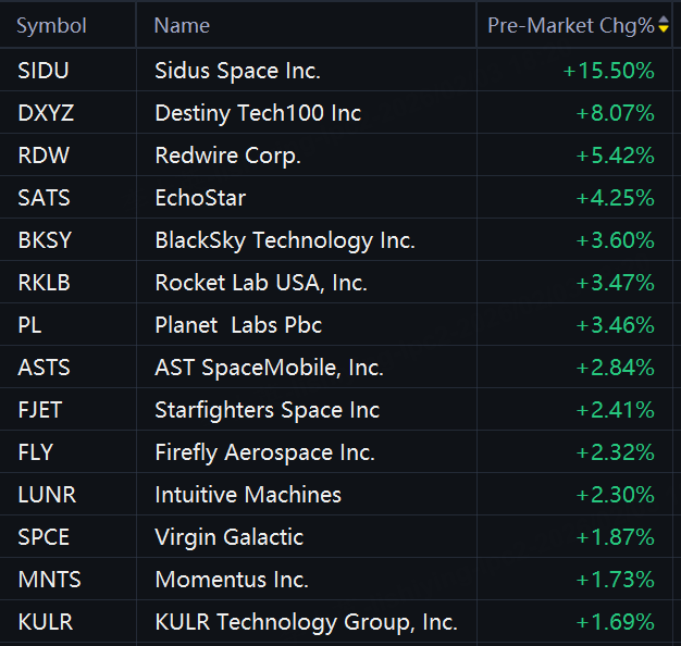 Space stocks jumped in premarket trading. Sidus Space rose 16%; Destiny Tech100 rose 8%; Redwire rose 5%; EchoStar, BlackSky Technology, Rocket Lab, and Planet Labs rose 4%; AST SpaceMobile rose 3%; Starfighters Space, Firefly Aerospace, Intuitive Machines, Virgin Galactic, Momentus, and KULR Technology rose 2%.