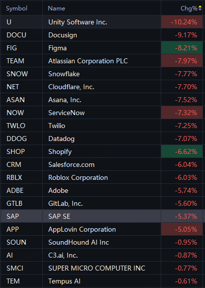 AI application software shares fell in Tuesday trading. Unity down 10%; Cloudflare, Snowflake, Figma down 8%; Shopify, ServiceNow down 7%; Roblox, Salesforce, Adobe down 6%; AppLovin down 5%.
