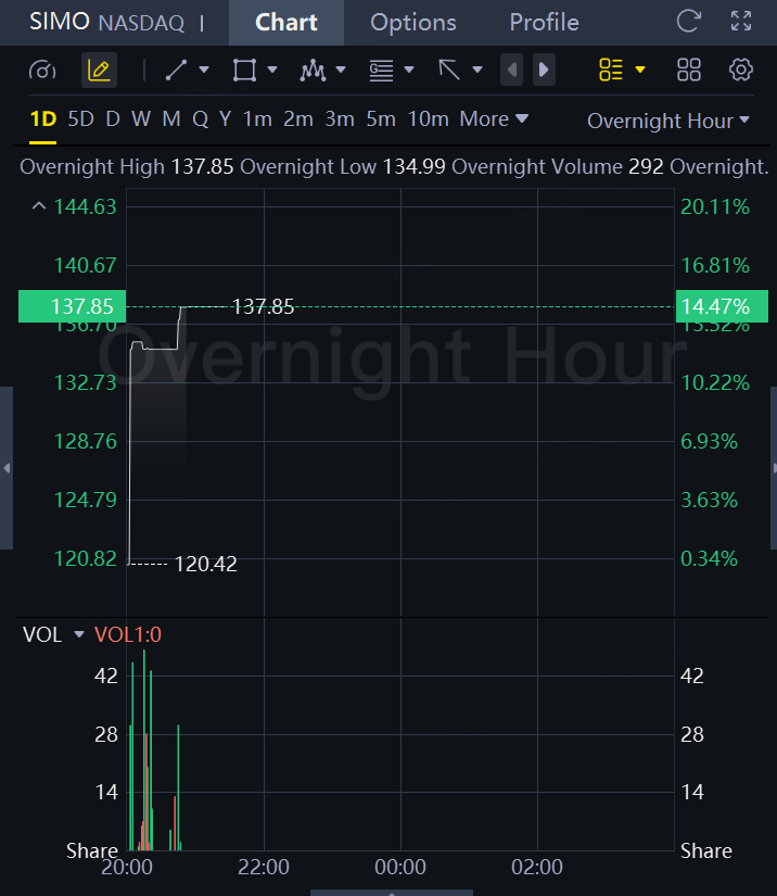 Silicon Motion Technology Corporation's stock surged 14% in overnight trading with significant momentum continuing into the night session following the release of its fourth-quarter financial results.