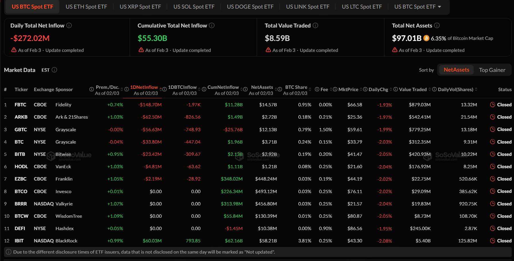The Bitcoin spot ETF with the highest net outflow on February 3 was Fidelity Wise Origin Bitcoin Fund (FBTC), with a net outflow of $148.7 million, according to SoSoValue.