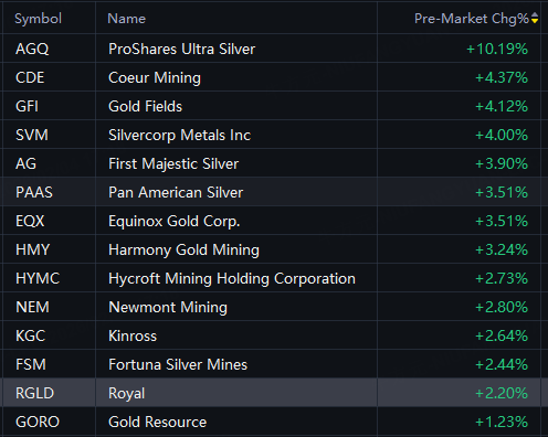 AGQ up 10%; Coeur Mining, Silvercorp Metal, First Majestic Silver, Pan American Silver up 4%; Newmont, Harmony Gold, Kinross up 3%.