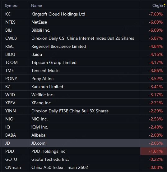 KingSoft Cloud down 8%; Bilibili down 6%; Baidu down 4%; XPeng down 3%; Alibaba, PDD, JD.com down 2%.