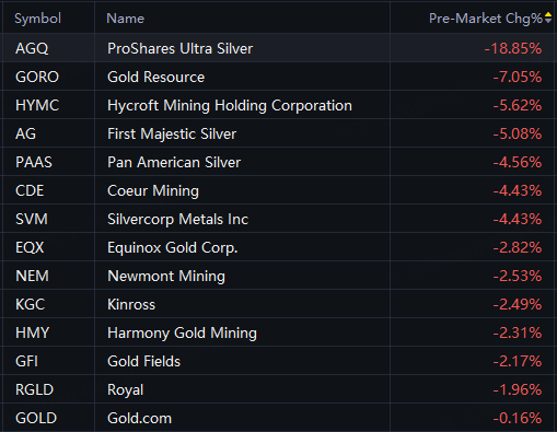 Gold and silver stocks fell in premarket trading on Thursday.