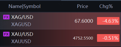 Spot silver fell 4.63% to $67.6 per ounce; spot gold fell 0.51% to $4,752.55 per ounce.