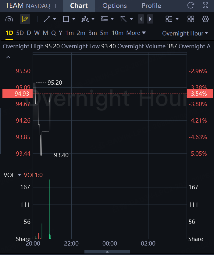 Atlassian Corporation PLC (TEAM) fell 3% in overnight trading, with significant selling pressure occurring during both intraday and after-hours trading sessions. The decline was driven by two primary factors. First, Truist Securities significantly reduced its price target for Atlassian from $210 to $150 while maintaining a Buy rating, a substantial 28.6% cut that likely prompted investor concern and selling during the regular trading session.