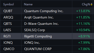 QUBT up 14%; ARQQ up 12%; SEALSQ, D-Wave Quantum up 11%; Rigetti Computing up 9%; IONQ, QMCO up 8%.
