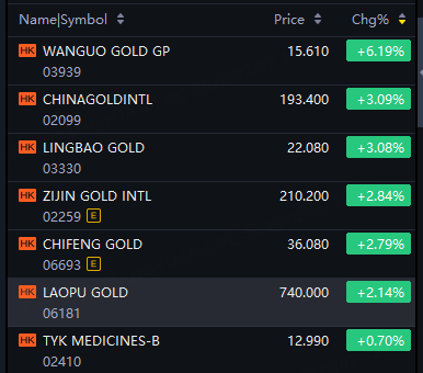 Wanguo Gold up 6%; China Gold Intl, Lingbao Gold, Zijin Gold, Chifeng Gold up 3%; Laopu Gold up 2%.