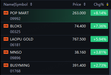 Pop Mart rose 8%; Bloks rose 7%; Laopu Gold up 6%; MNSO up 4%; BUSYMING up 3%.
