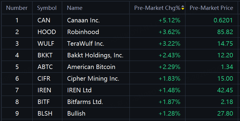 Some crypto stocks gained in premarket trading. Robinhood, TeraWulf up over 3%; Bakkt Holdings, American Bitcoin up over 2%.