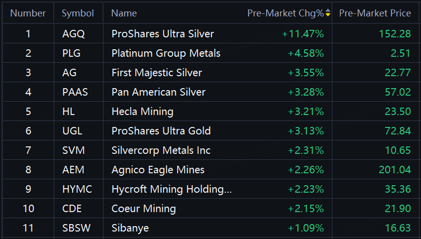 Precious metal shares and ETFs rose in premarket trading. ProShares Ultra Silver up over 11%; Platinum Group up over 4%; First Majestic Silver, Pan American Silver up over 3%.