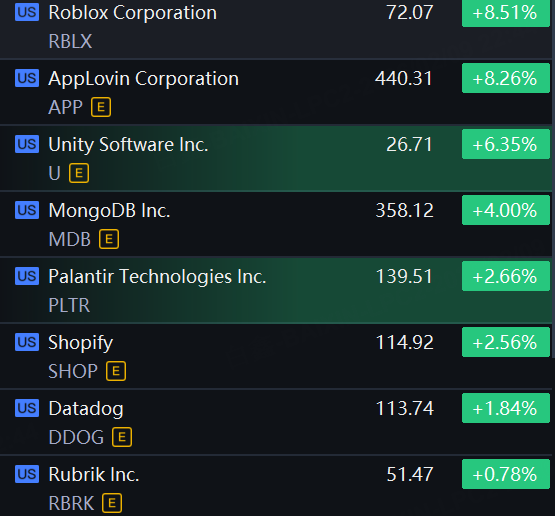 AI Application Shares Rebounded. Roblox and AppLovin up 8%; Unity up 6%; MongoDB up 4%; Palantir and Shopify up 2%.