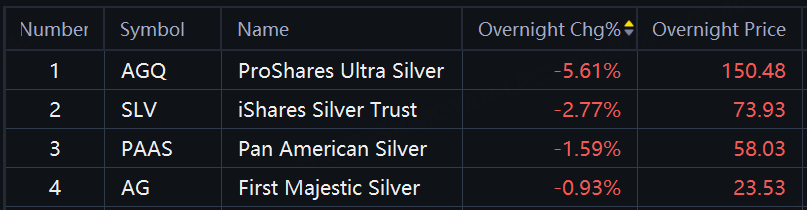 Silver stocks and ETFs fell in overnight trading as spot silver dropped 2% to $81.7 per ounce. AGQ down over 5%; SLV down about 3%; Pan American Silver down over 1%.