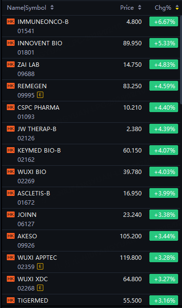 ImmuneOnco up 7%; Zai Lab, Remegen, Innovent Bio up 5%; Ascletis, Wuxi Bio up 4%; AKESO up 3%.