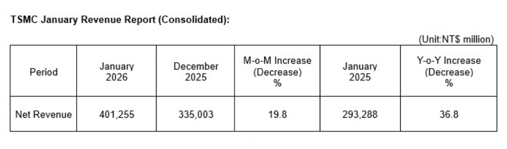 TSMC today announced its net revenue for January 2026: On a consolidated basis, revenue for January 2026 was approximately NT$401.26 billion, an increase of 19.8 percent from December 2025 and an increase of 36.8 percent from January 2025.