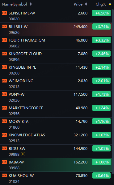 SenseTime up 7%; Bilibili up 4%; Fourth Paradigm up 3%; Weimob, KingSoft Cloud up 2%; Alibaba, Kuaishou, Knowledge Atlas up 1%.
