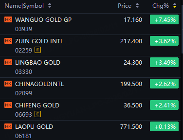 Wanguo Gold up 7%; Zijin Gold Intl up 4%; Lingbao Gold, China Gold Intl up 3%; Chifeng Gold up 2%.