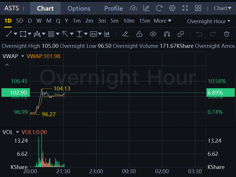 Shares of AST SpaceMobile rose about 7% in overnight trading.