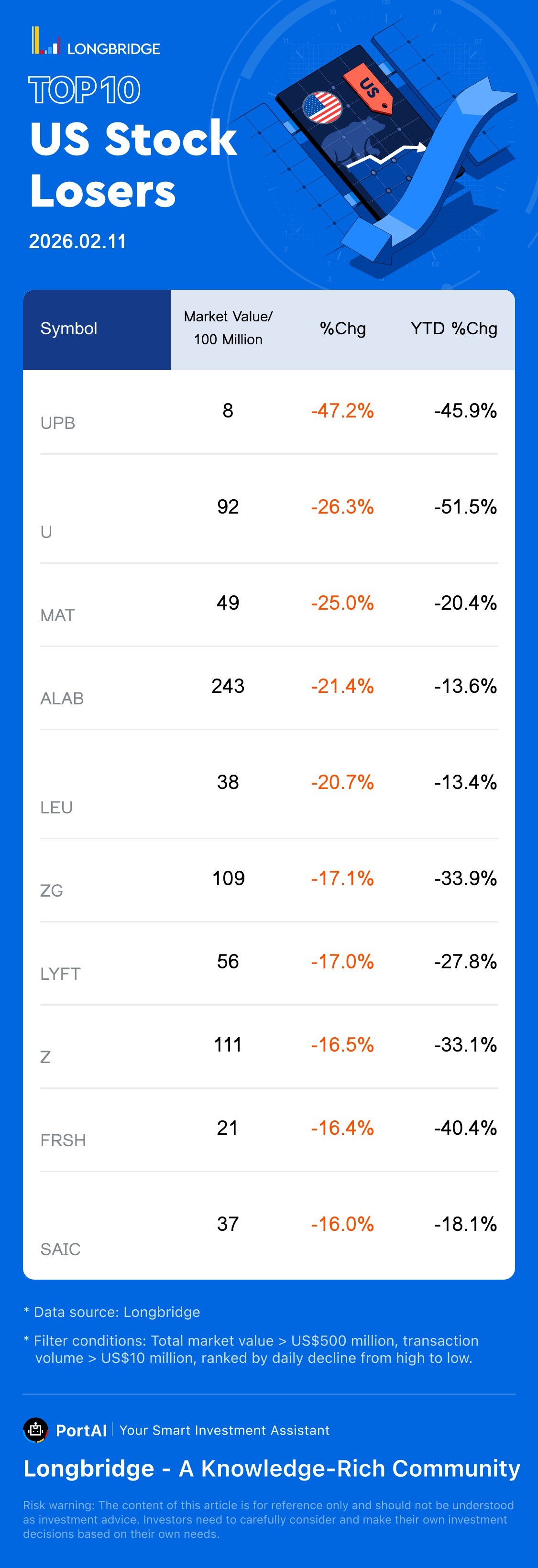 Unity Software(U) fell 26.32%, with a trading turnover 2.2 Billion USD, and a year-to-date fell 51.5%.