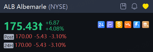 Albemarle, the world's largest producer of lithium, posted a larger-than-expected quarterly loss on Wednesday and said it would idle a major Australian processing plant as it continues to face weak prices for the battery metal. The shares dropped 3% in overnight trading.