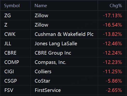 As of the close of trading that day, Zillow fell 17%; Cushman & Wakefield fell 14%; Jones Lang LaSalle fell 13%; CBRE Group and Compass fell 12%; Colliers fell 11%; CoStar fell 6%; FirstService fell 3%.