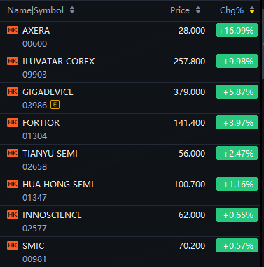 Axera up 16%; Iluvatar CoreX up 10%; GigaDevice up 6%; Fortior up 4%; Tianyu Semi up 2%; Hua Hong Semi, SMIC up 1%.