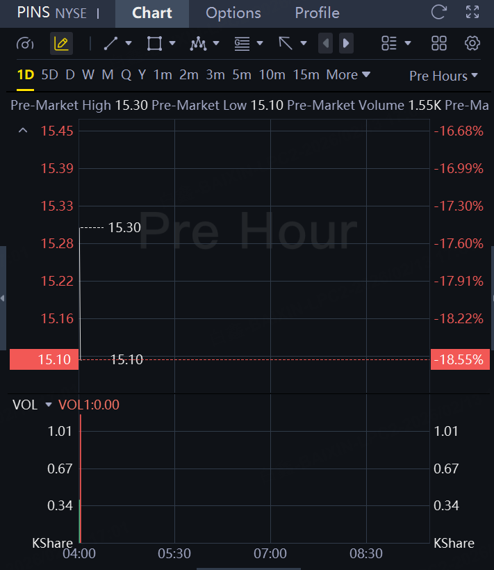 Pinterest forecast first-quarter revenue below estimates, underscoring the image-sharing platform's ongoing struggle to compete for advertising dollars against deep-pocketed platforms, sending its shares down 19% in premarket trading.