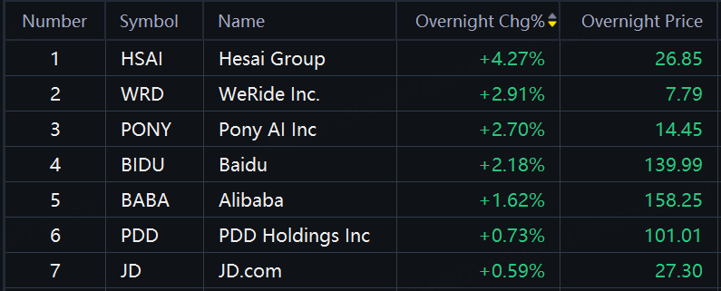 Chinese ADRs and ETFs jumped in overnight trading. Hesai Group up over 4%; WeRide, Pony AI up about 3%; Baidu, Alibaba up around 2%.