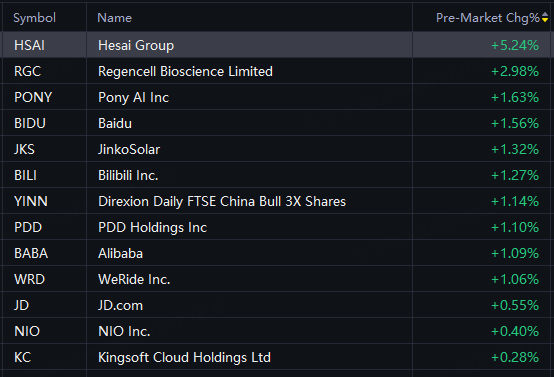 Hesai up 5%; Pony AI, Baidu up 2%; Bilibili, Alibaba, PDD up 1%.