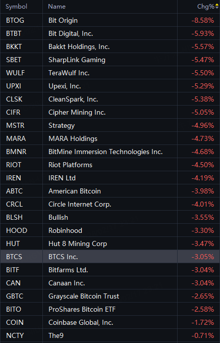 Bit Origin down 9%; BTBT down 6%; Strategy, SBET, CleanSpark, BMNR down 5%; Circle down 4%; Robinhood down 3%; Coinbase down 2%.