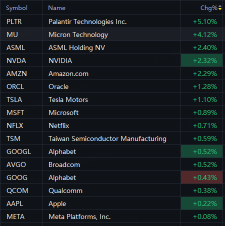 Big tech stocks rose in Wednesday trading. Palantir up 5%; Micron up 4%; Nvidia, Amazon, ASML up 2%; Tesla, Microsoft up 1%.