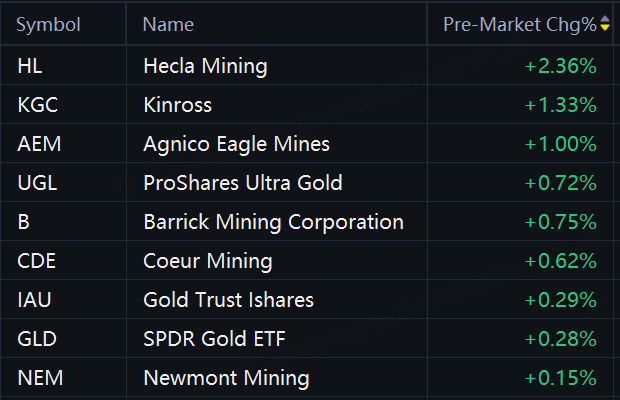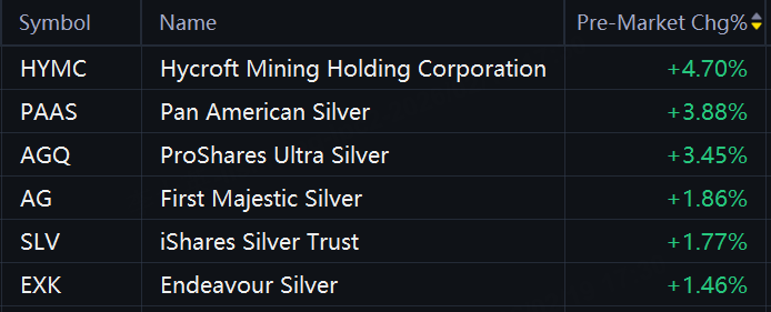 Gold, silver stocks and ETFs rose in premarket trading. Hycroft Mining rose 5%; Pan American Silver and ProShares Ultra Silver rose 4%; Hecla Mining, First Majestic Silver, iShares Silver Trust, and Endeavour Silver rose 2%; Kinross and Agnico Eagle Mines rose 1%.