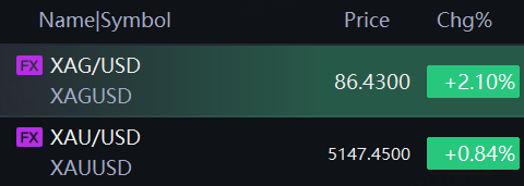 Spot gold rose 0.84% to $5,147.45 per ounce; Spot silver rose 2.1% to $86.43 per ounce.