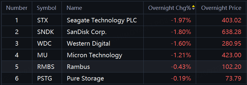 Storage shares slid in overnight trading. Seagate Tech, SanDisk, Western Digital, Micron down over 1%.