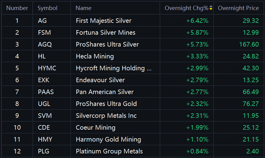 Precious metal shares and ETFs jumped in overnight trading. First Majestic Silver, ProShares Ultra Silver up around 6%; Hecla Mining, HYMC up around 3%.