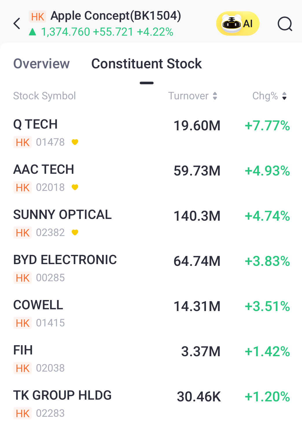 Apple concept shares rose in Hong Kong. Q Tech up nearly 8%; AAC Tech, Sunny Optical up nearly 5%; BYD Electronic up 4%; Cowell up over 3%.