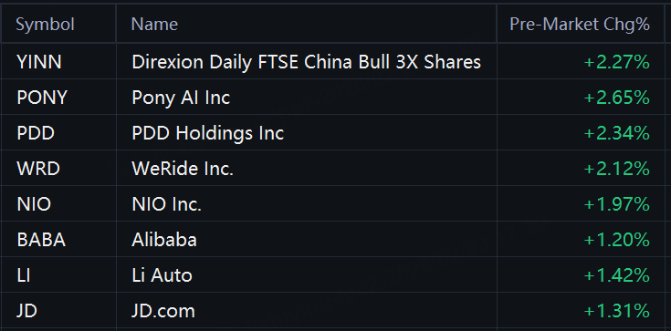 Direxion Daily FTSE China Bull 3X Shares rose 2%; Pony AI rose 3%; PDD Holdings, WeRide, and NIO rose 2%; Li Auto, Alibaba, and JD.com rose 1%.