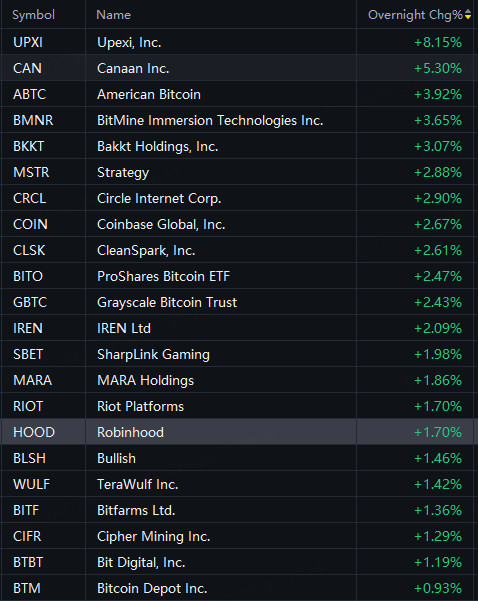 Upexi up 8%; Canaan up 5%; BMNR up 4%; Circle, Strategy, Coinbase up 3%; SBET, Robinhood up 2%.
