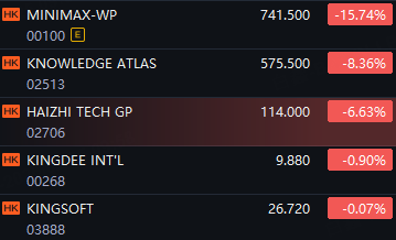 Some HK AI App Stocks Tumbled. MiniMax down 16%; Knowledge Atlas down 8%; Haizhi Tech down 7%.