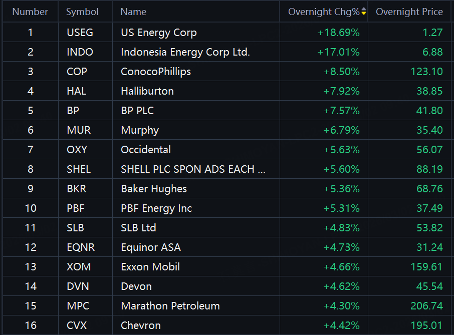 Oil stocks surged in overnight trading. US Energy up over 18%; Indonesia Energy up 17%; ConocoPhillips, Halliburton up around 8%; Occidental up over 5%.