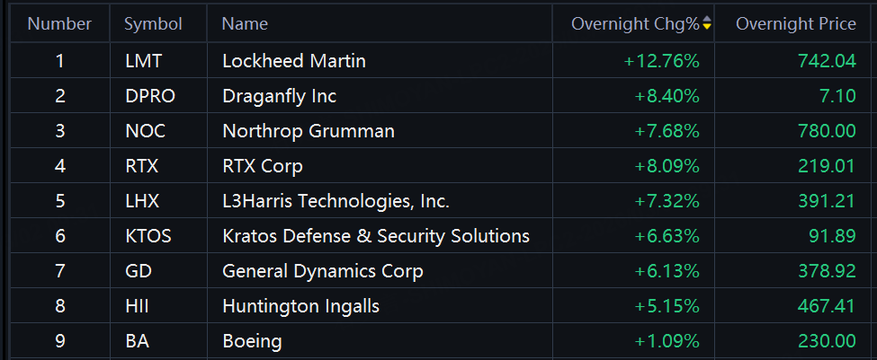 Defense stocks rallied in overnight trading. Lockeed Martin up nearly 13%; Draganfly, RTX Corp up over 8%; Northrop Grumman, L3Harris Technologies up over 7%.